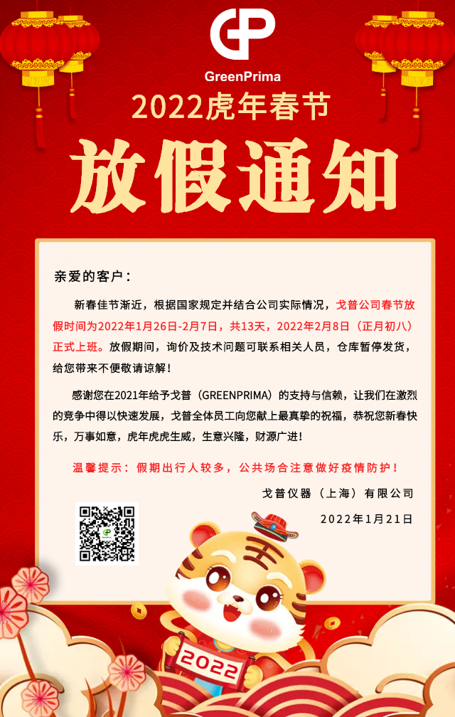 歡歡喜喜迎虎年!戈普公司春節(jié)放假時(shí)間為2022年1月26日-2月7日,共13天,放假期間,有詢價(jià)或技術(shù)問題請(qǐng)撥打相關(guān)人員移動(dòng)電話,倉庫暫停發(fā)貨,給您帶...